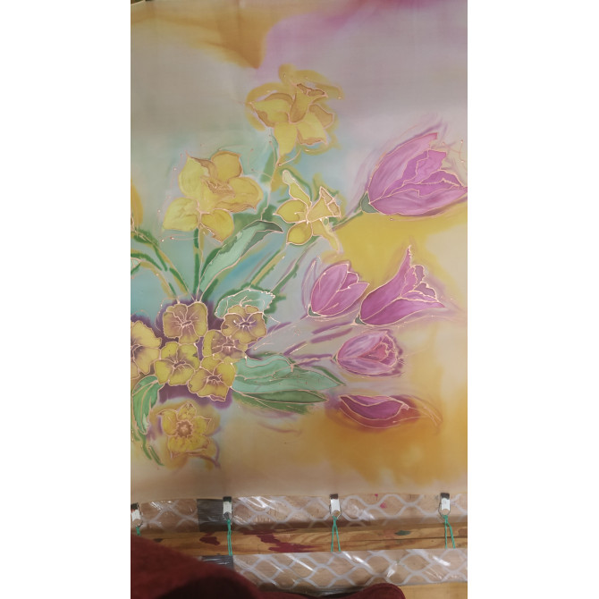 Ručne maľovaná hodvábna šatka 90x90 cm. Je na nej namaľovaný vzor na žiadosť klientky, ktorá má rada narcisy a tulipány. Je stálofarebná a je potrebné prať v rukách a žehliť mierne vlhký výrobok
